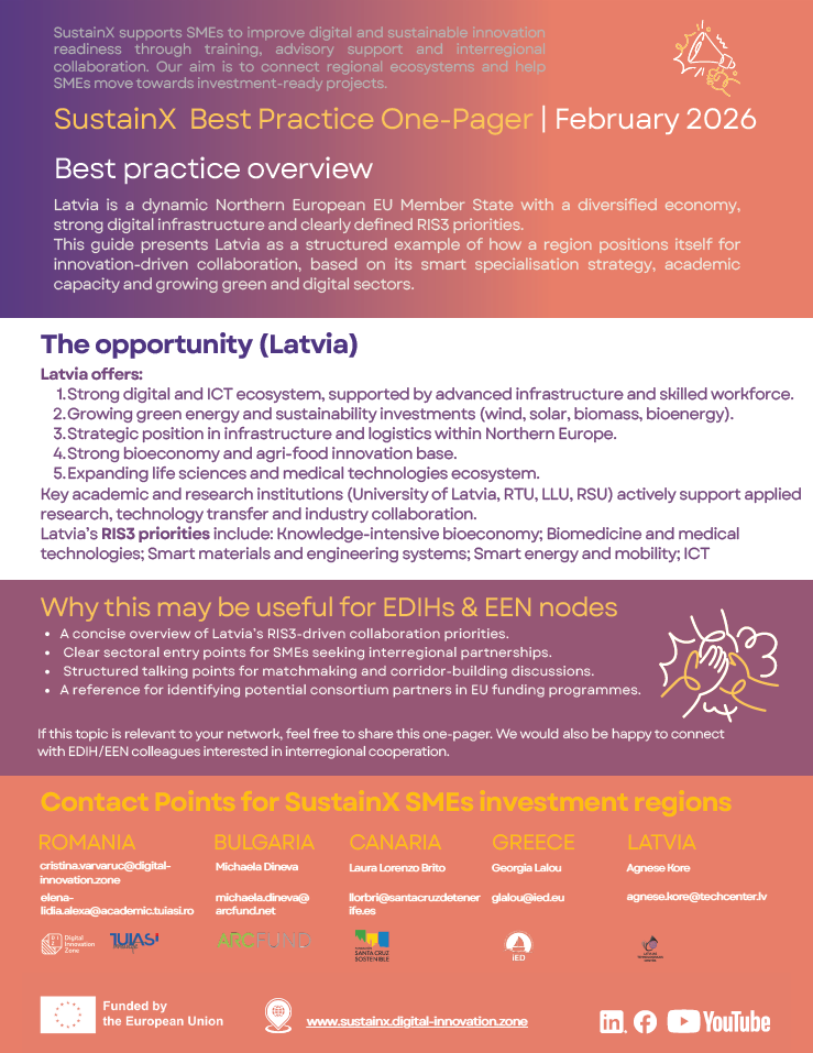 The one-pagers present transferable practices, collaboration examples and practical insights emerging from the implementation of SustainX across partner regions. Their aim is to support EDIHs and EENs in staying informed about project outcomes and in sharing relevant knowledge within their innovation ecosystems.
